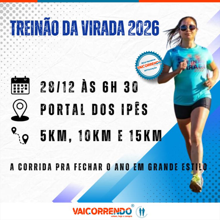 A quinta edição do Treinão da Virada, que recebe o selo premium VaiCorrendo.com de divulgação, terá largada e chegada no Portal dos Ipês (Rua 5). A cidade do evento é Ribeirão Preto, interior paulista. O treino terá largada às 6h30 do dia 28 de dezembro de 2025 (domingo) com percursos de 5 km, 10 km e 15 km para corrida. A concentração será às 6h. Corra e divirta-se no último treinão do ano!