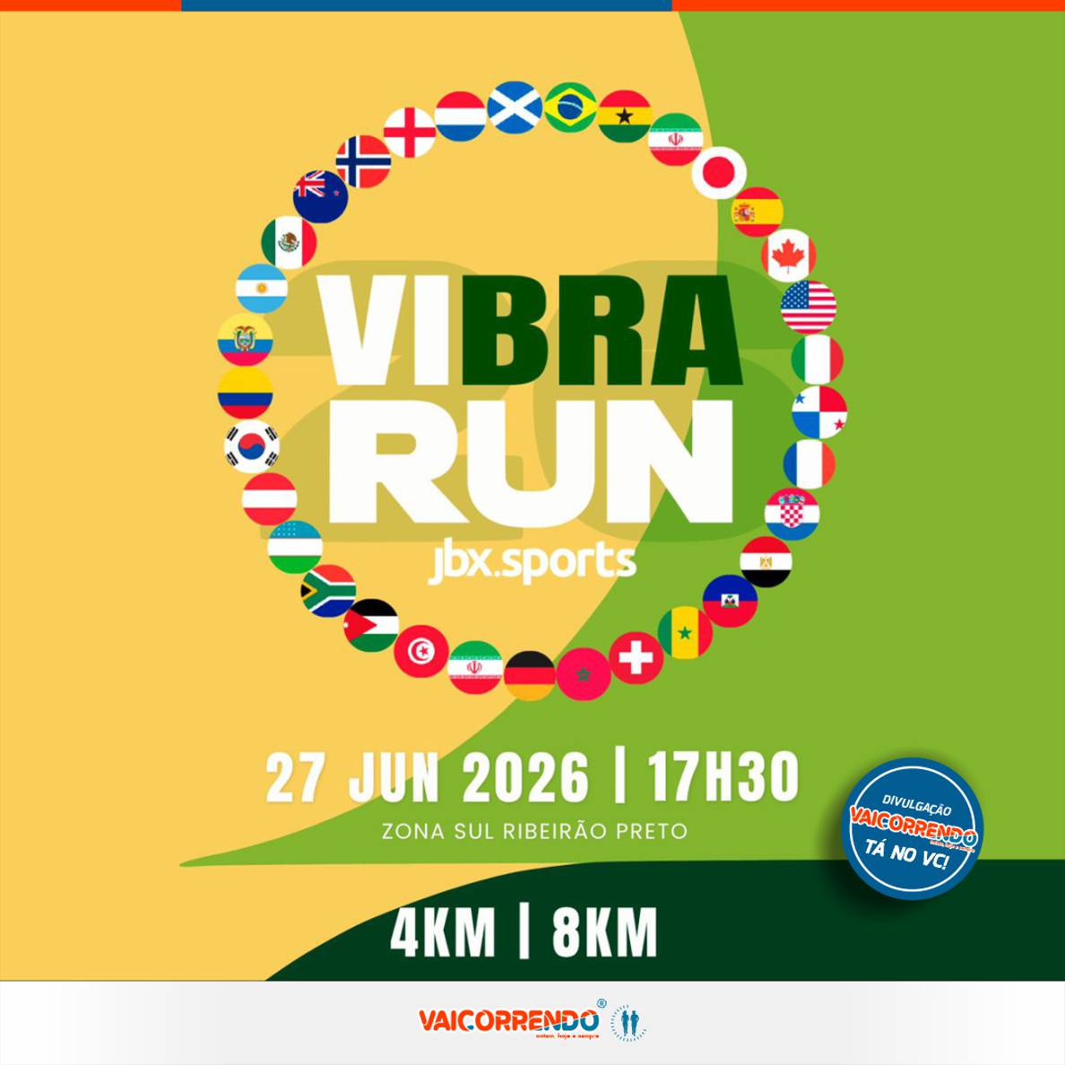 A Vibra Run, que recebe o selo premium VaiCorrendo.com de divulgação, terá largada e chegada na Avenida Tuffy Said, Zona Sul. A cidade do evento é Ribeirão Preto, interior paulista. A prova terá início às 17h30 do dia 27 de junho de 2026 (sábado) com percursos de 4 km e 8 km para corrida e de 4 km para caminhada.